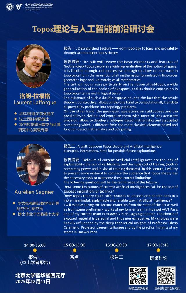 报告人介绍:Laurent Lafforgue is a mathematician. He worked mainly in algebraic geometry and harmonic analysis. He was awarded the Fields Medal in 2002 for his contribution to the “Langlands program”, which relates Galois Theory and Automorphic Representations Theory by applying Grothendieck’s general theories to the study of special moduli algebraic spaces discovered by Drinfeld. In the last decade, his main interest gradually shifted to Grothendieck Topos Theory. He moved to Huawei in 2021. At the Lagrange Center in Paris, which was created by Huawei but works as an academic institution, he collaborates with scientists from academia on the one hand and Huawei researchers on the other hand, especially Dr Aurélien Sagnier. He works on the development of Topos Theory, more particularly of Olivia Caramello’s Theory of “Toposes as Bridges”, and the elaboration of new forms of AI based on it.